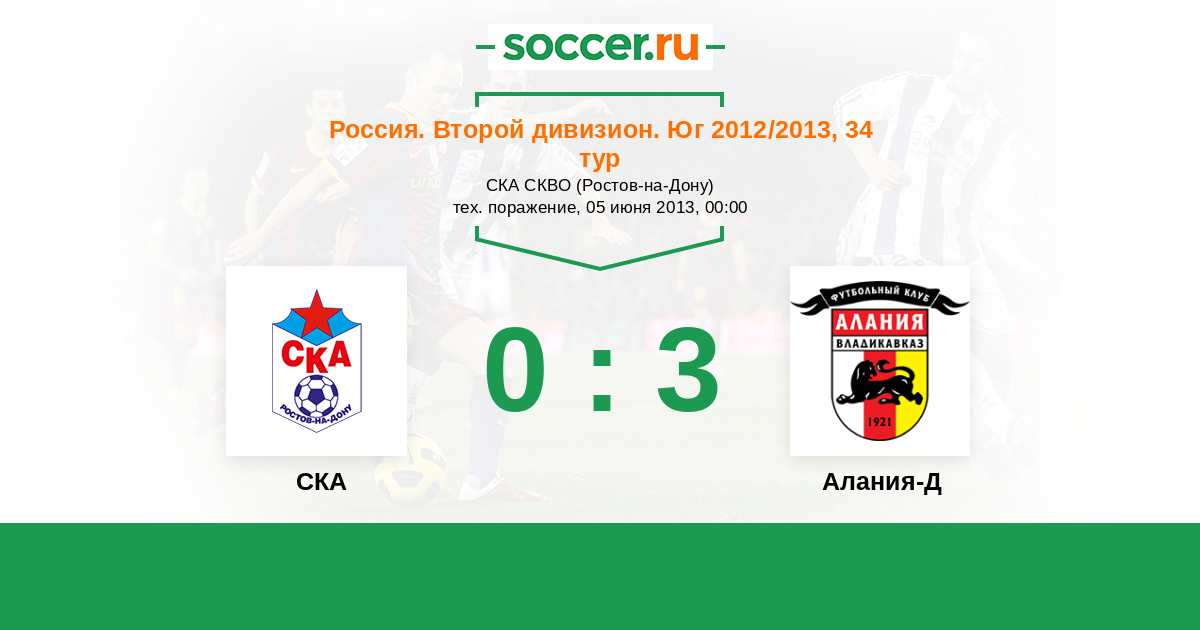 Россия. Вторая лига. Группа 1 17.07.2013 Алания-Д Логотип футбольный клуб Алания-Д (Владикавказ) 3:4 Логотип футбольный клуб СКА (Ростов-на-Дону) СКА
