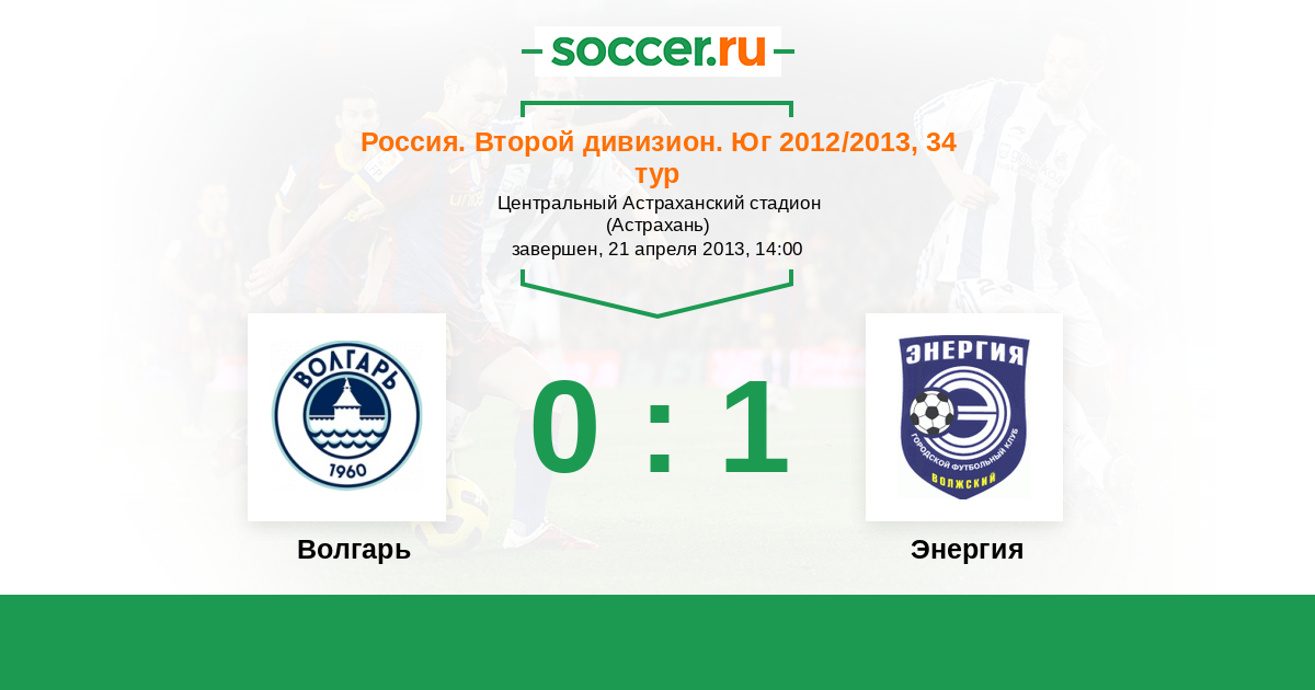 Россия. Вторая лига. Группа 1 30.07.2013 Энергия Логотип футбольный клуб Энергия (Волжский) 2:4 Логотип футбольный клуб Волгарь (Астрахань) Волгарь