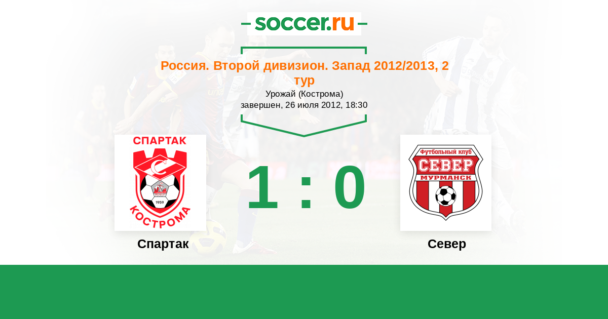 Россия. Вторая лига. Группа 2 18.07.2013 Север Логотип футбольный клуб Север (Мурманск) 3:1 Логотип футбольный клуб Спартак Кострома Спартак Кострома
