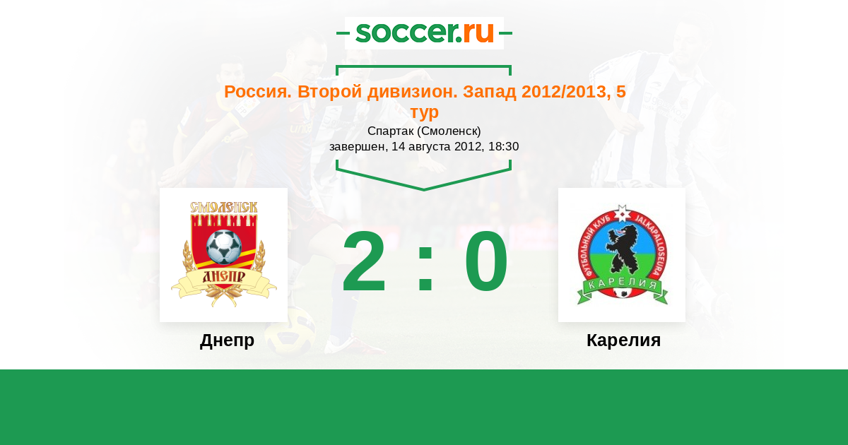Россия. Вторая лига. Группа 2 08.05.2013 Карелия Логотип футбольный клуб Карелия (Петрозаводск) 1:3 Логотип футбольный клуб Днепр (Смоленск) Днепр