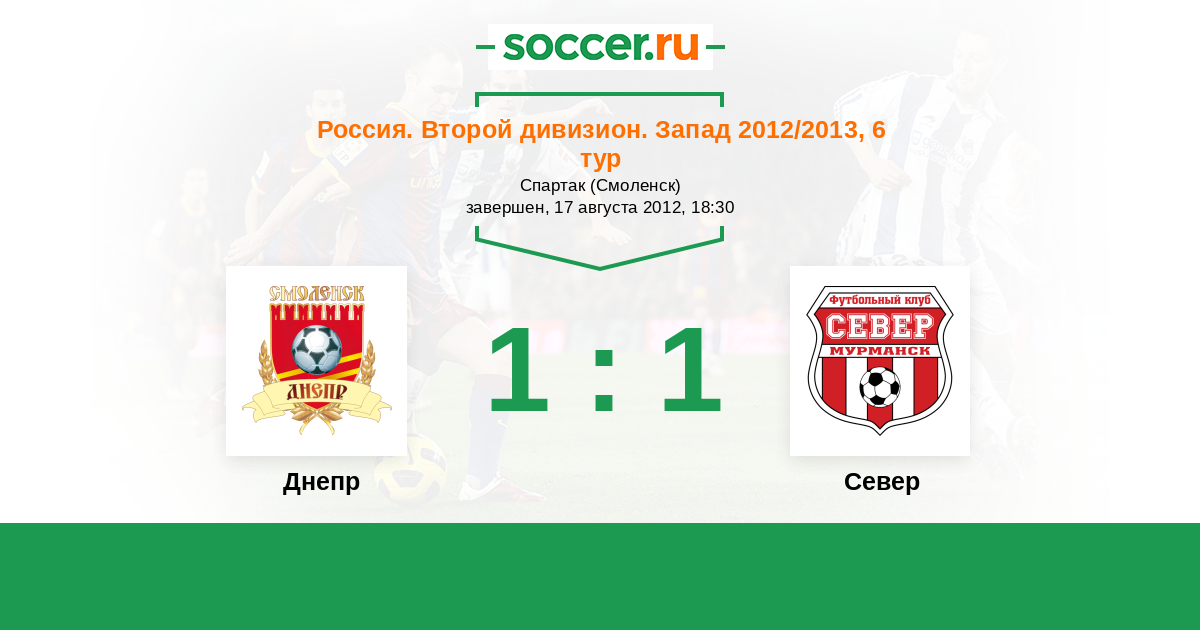 Россия. Вторая лига. Группа 2 18.08.2013 Север Логотип футбольный клуб Север (Мурманск) 4:1 Логотип футбольный клуб Днепр (Смоленск) Днепр