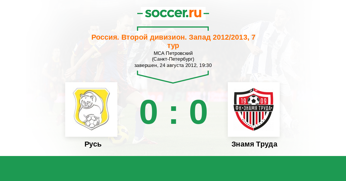 Россия. Вторая лига. Группа 2 27.07.2013 Знамя Труда Логотип футбольный клуб Знамя Труда (Орехово-Зуево) 1:0 Логотип футбольный клуб Русь (Санкт-Петербург) Русь