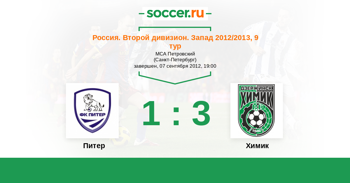 Россия. Вторая лига. Группа 2 20.04.2013 Химик Логотип футбольный клуб Химик (Дзержинск) 2:1 Логотип футбольный клуб Питер (Санкт-Петербург) Питер