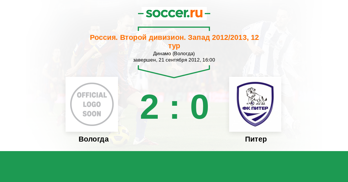 Россия. Вторая лига. Группа 2 25.10.2012 Питер Логотип футбольный клуб Питер (Санкт-Петербург) 1:2 Логотип футбольный клуб Вологда Вологда
