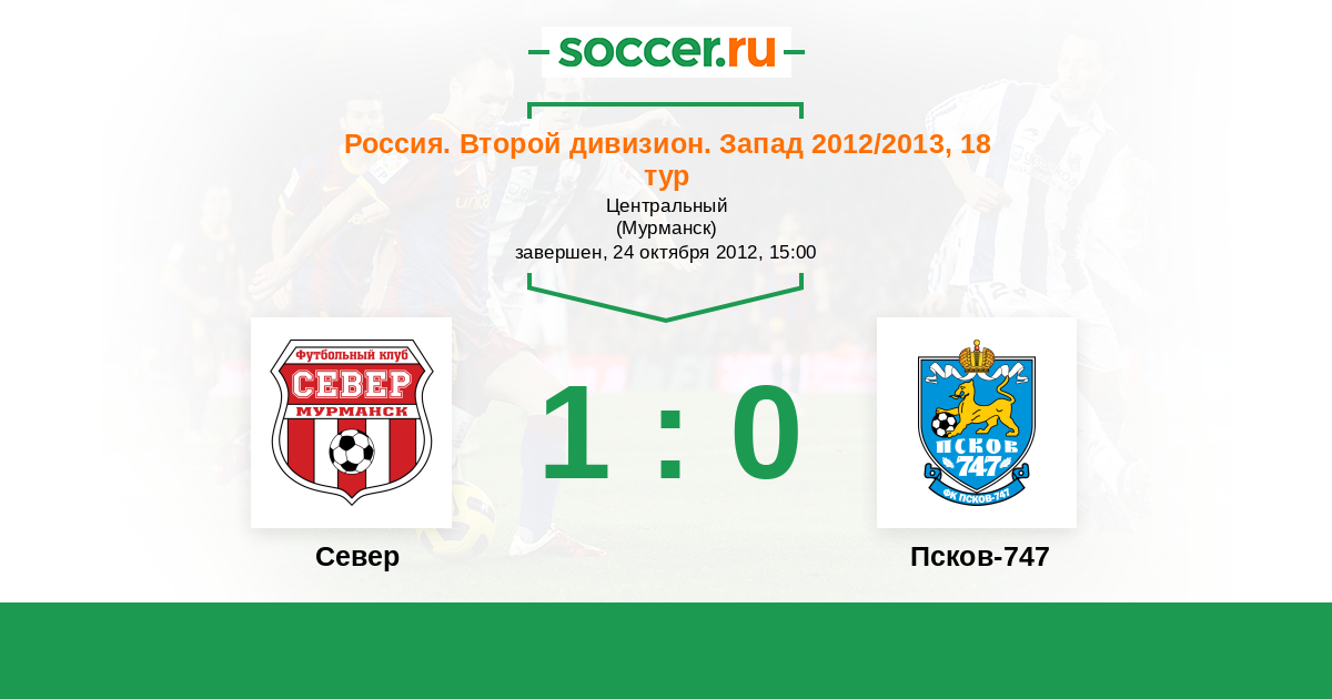Россия. Вторая лига. Группа 2 21.09.2012 Псков-747 Логотип футбольный клуб Псков-747 3:1 Логотип футбольный клуб Север (Мурманск) Север