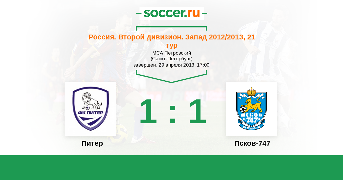 Россия. Вторая лига. Группа 2 29.04.2013 Питер Логотип футбольный клуб Питер (Санкт-Петербург) 1:1 Логотип футбольный клуб Псков-747 Псков-747