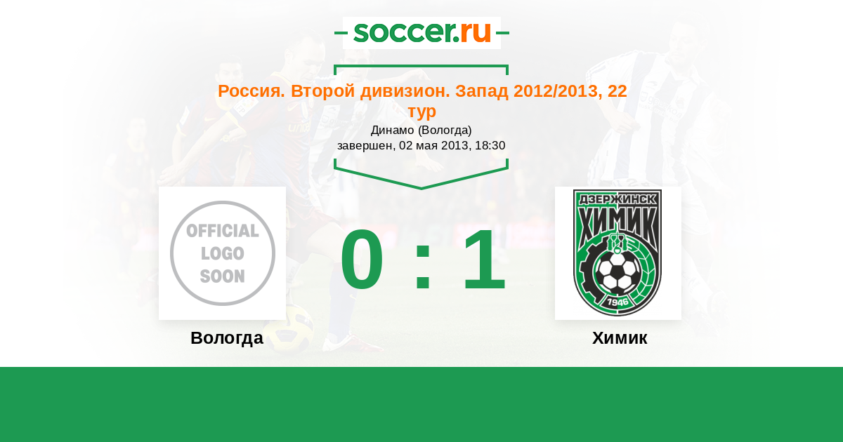Россия. Вторая лига. Группа 2 27.08.2012 Химик Логотип футбольный клуб Химик (Дзержинск) 3:0 Логотип футбольный клуб Вологда Вологда