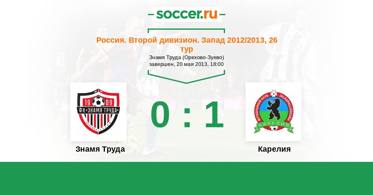 Россия. Вторая лига. Группа 2 06.08.2012 Карелия Логотип футбольный клуб Карелия (Петрозаводск) 2:1 Логотип футбольный клуб Знамя Труда (Орехово-Зуево) Знамя Труда