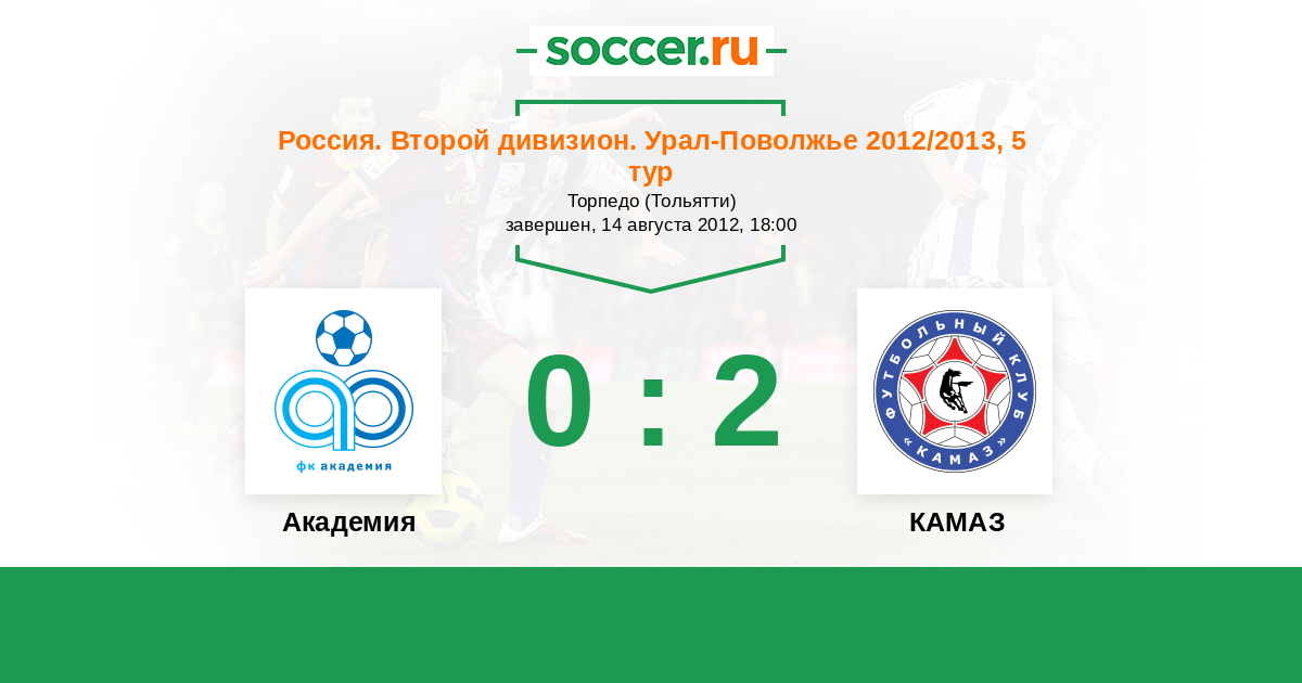 Россия. Вторая лига. Группа 4 18.04.2013 КАМАЗ Логотип футбольный клуб КАМАЗ (Набережные Челны) 3:0 Логотип футбольный клуб Академия (Тольятти) Академия
