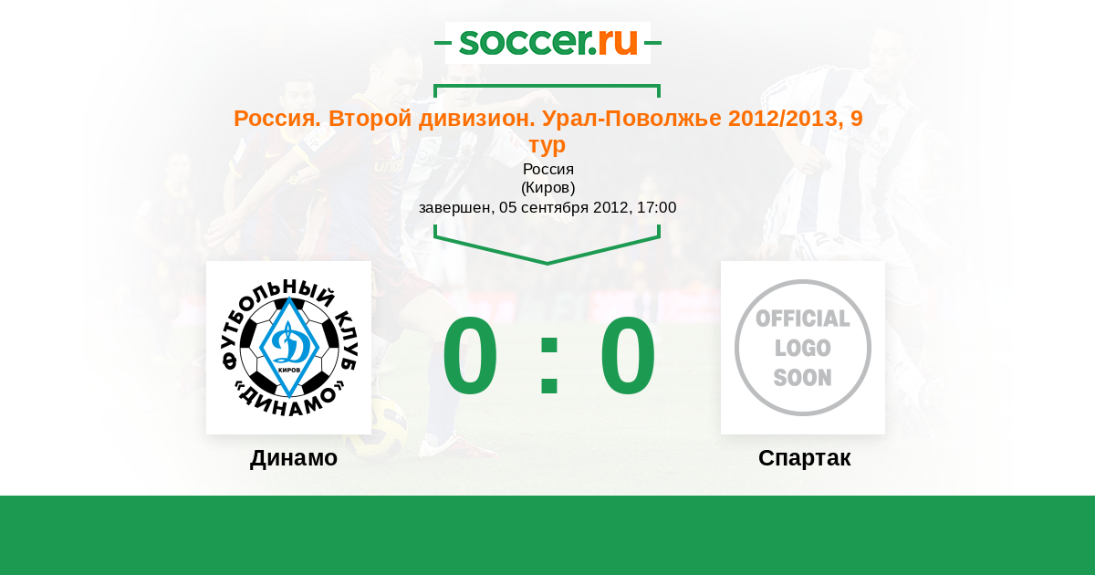 Россия. Вторая лига. Группа 4 24.09.2013 Динамо Киров Логотип футбольный клуб Динамо Киров 0:0 Логотип футбольный клуб Спартак (Йошкар-Ола) Спартак