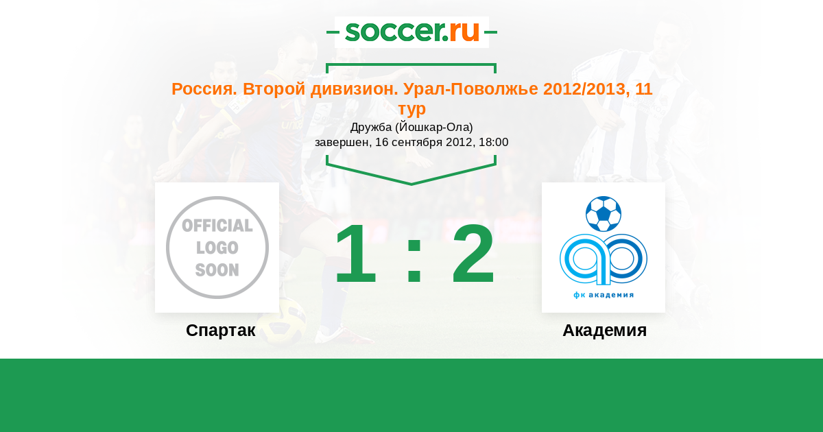 Россия. Вторая лига. Группа 4 15.05.2013 Академия Логотип футбольный клуб Академия (Тольятти) 0:3 Логотип футбольный клуб Спартак (Йошкар-Ола) Спартак