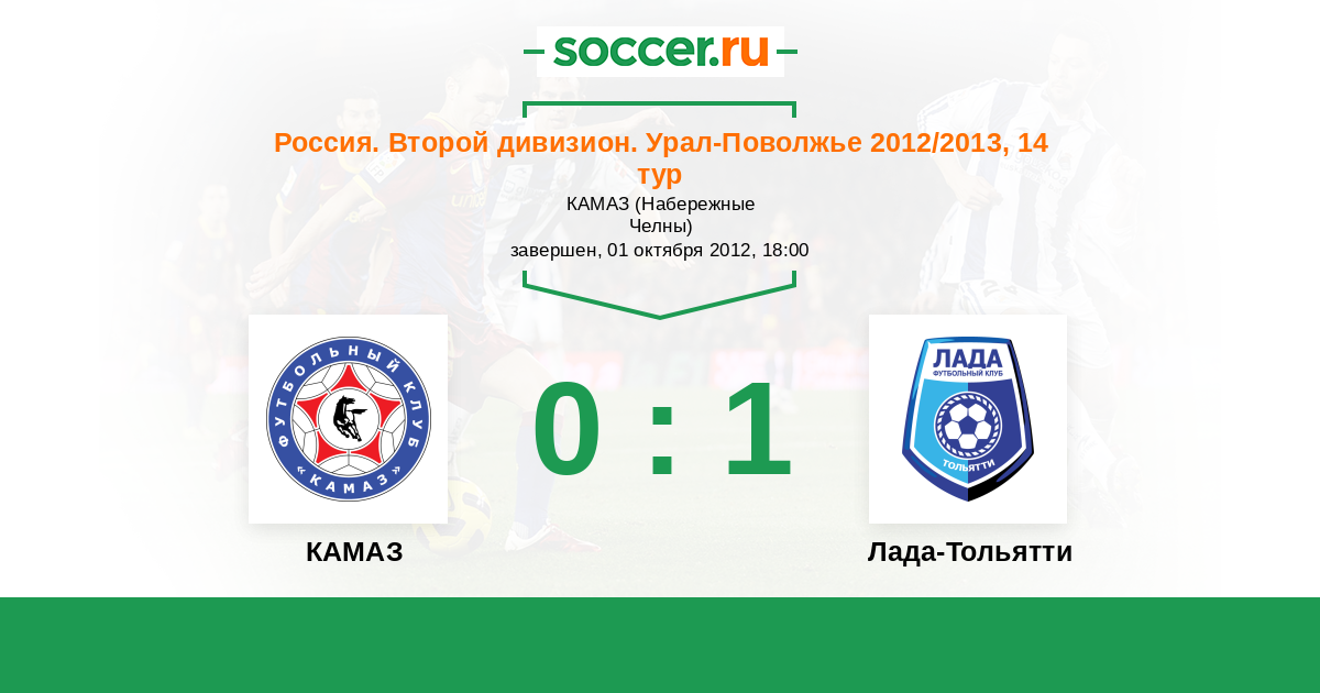 Россия. Вторая лига. Группа 4 19.09.2013 КАМАЗ Логотип футбольный клуб КАМАЗ (Набережные Челны) 3:2 Логотип футбольный клуб Лада-Тольятти Лада-Тольятти
