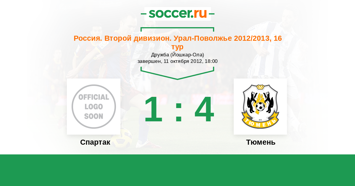 Россия. Вторая лига. Группа 4 14.09.2013 Тюмень Логотип футбольный клуб Тюмень 4:1 Логотип футбольный клуб Спартак (Йошкар-Ола) Спартак