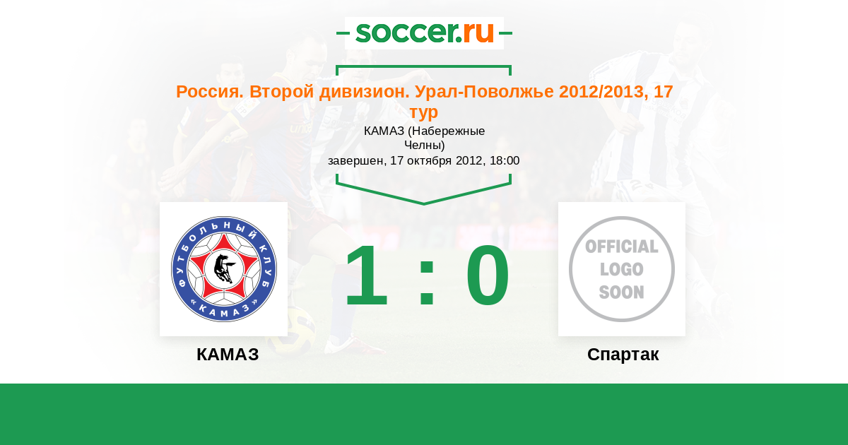 Россия. Вторая лига. Группа 4 21.07.2012 Спартак Логотип футбольный клуб Спартак (Йошкар-Ола) 1:1 Логотип футбольный клуб КАМАЗ (Набережные Челны) КАМАЗ