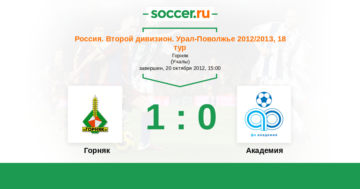 Россия. Вторая лига. Группа 4 24.07.2012 Академия Логотип футбольный клуб Академия (Тольятти) 1:0 Логотип футбольный клуб Горняк (Учалы) Горняк