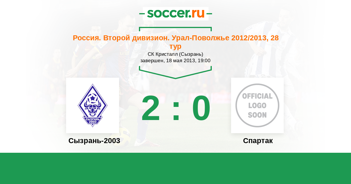 Россия. Вторая лига. Группа 4 18.07.2013 Сызрань-2003 Логотип футбольный клуб Сызрань-2003 1:0 Логотип футбольный клуб Спартак (Йошкар-Ола) Спартак