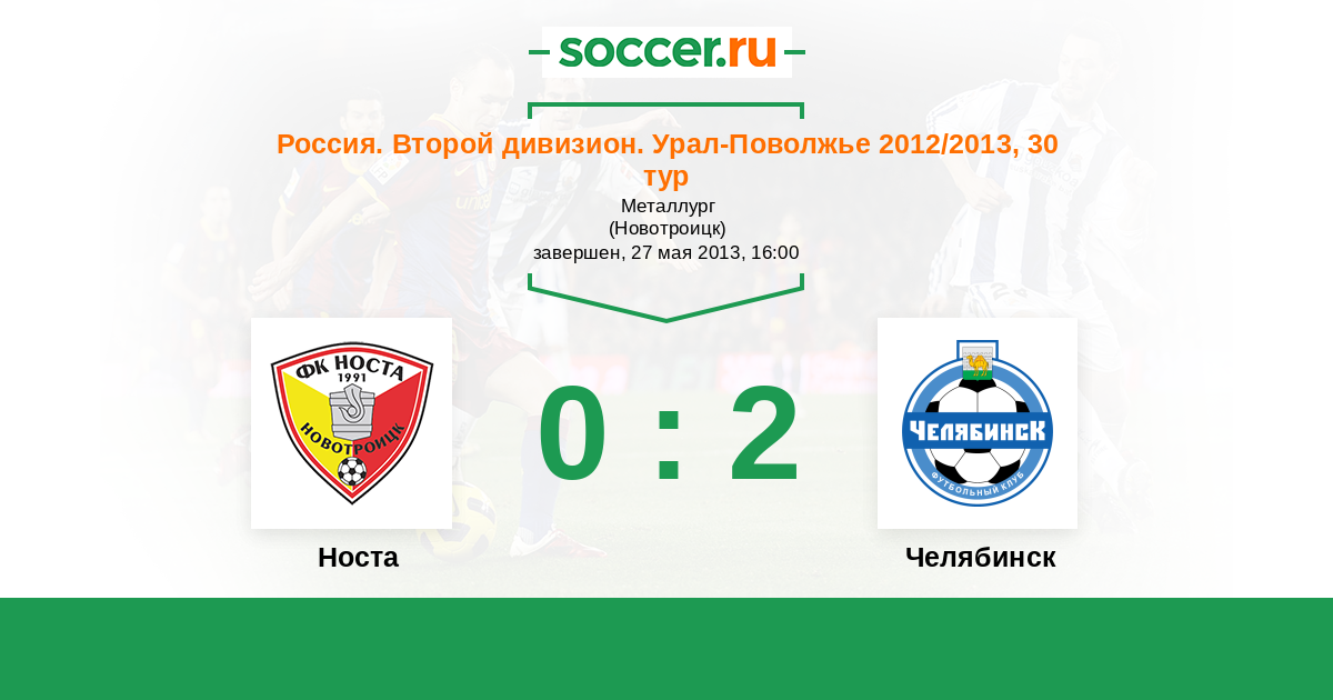 Россия. Вторая лига. Группа 4 18.05.2012 Носта Логотип футбольный клуб Носта (Новотроицк) 1:1 Логотип футбольный клуб Челябинск Челябинск