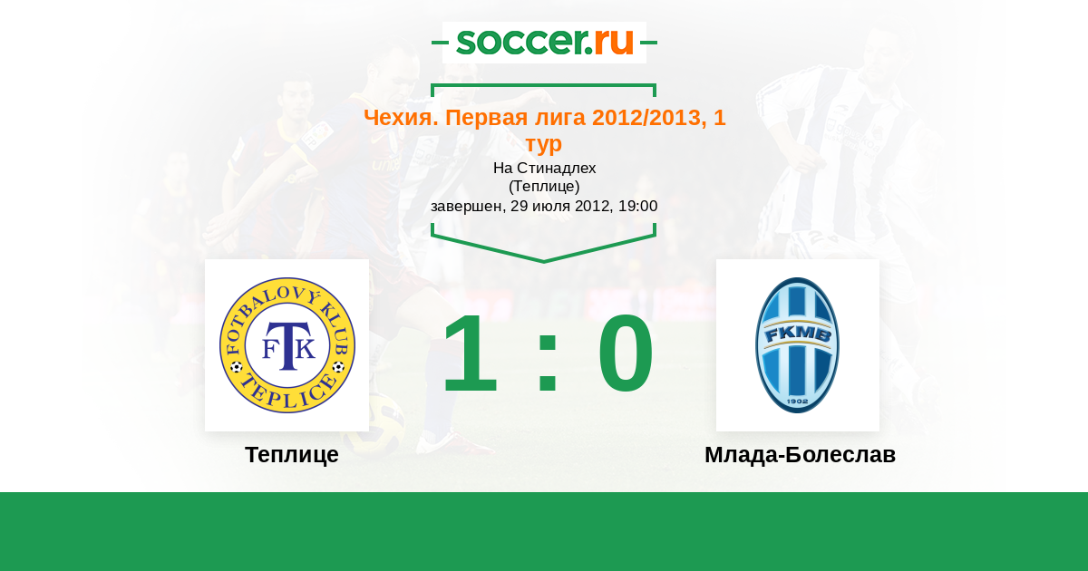 Чехия. Первая Лига 01.09.2013 Млада-Болеслав Логотип футбольный клуб Млада-Болеслав 1:0 Логотип футбольный клуб Теплице Теплице