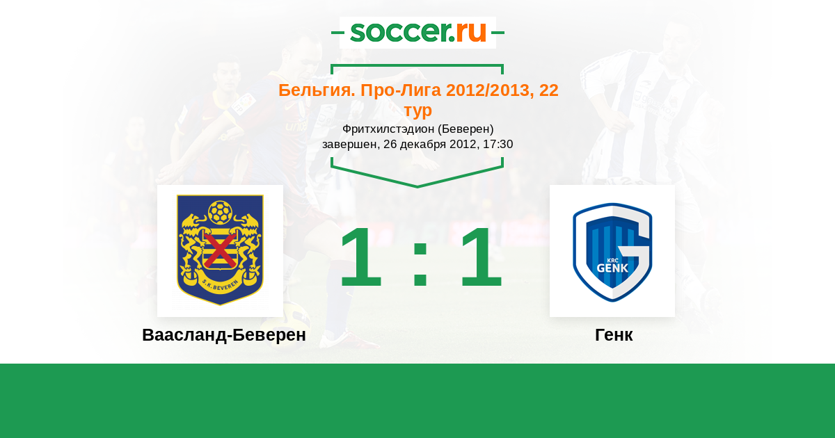 Бельгия. Про-Лига 22.09.2013 Ваасланд-Беверен Логотип футбольный клуб Ваасланд-Беверен 0:0 Логотип футбольный клуб Генк Генк