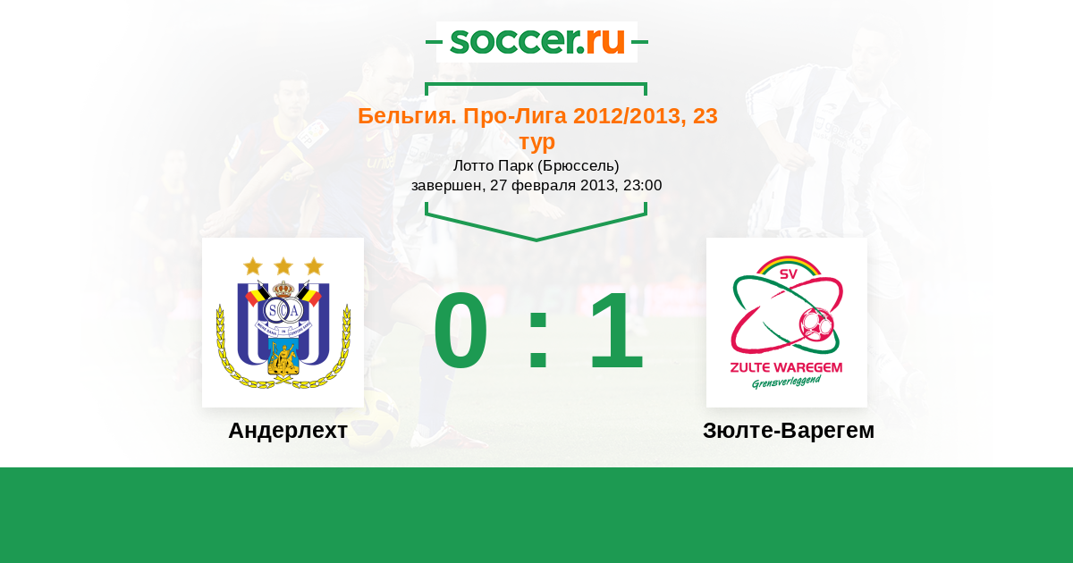 Бельгия. Про-Лига 21.03.2012 Андерлехт Логотип футбольный клуб Андерлехт (Брюссель) 2:1 Логотип футбольный клуб Зюлте-Варегем Зюлте-Варегем