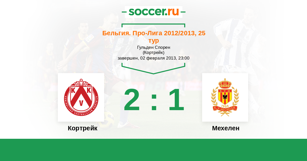 Бельгия. Про-Лига 06.10.2012 Мехелен Логотип футбольный клуб Мехелен 0:2 Логотип футбольный клуб Кортрейк Кортрейк