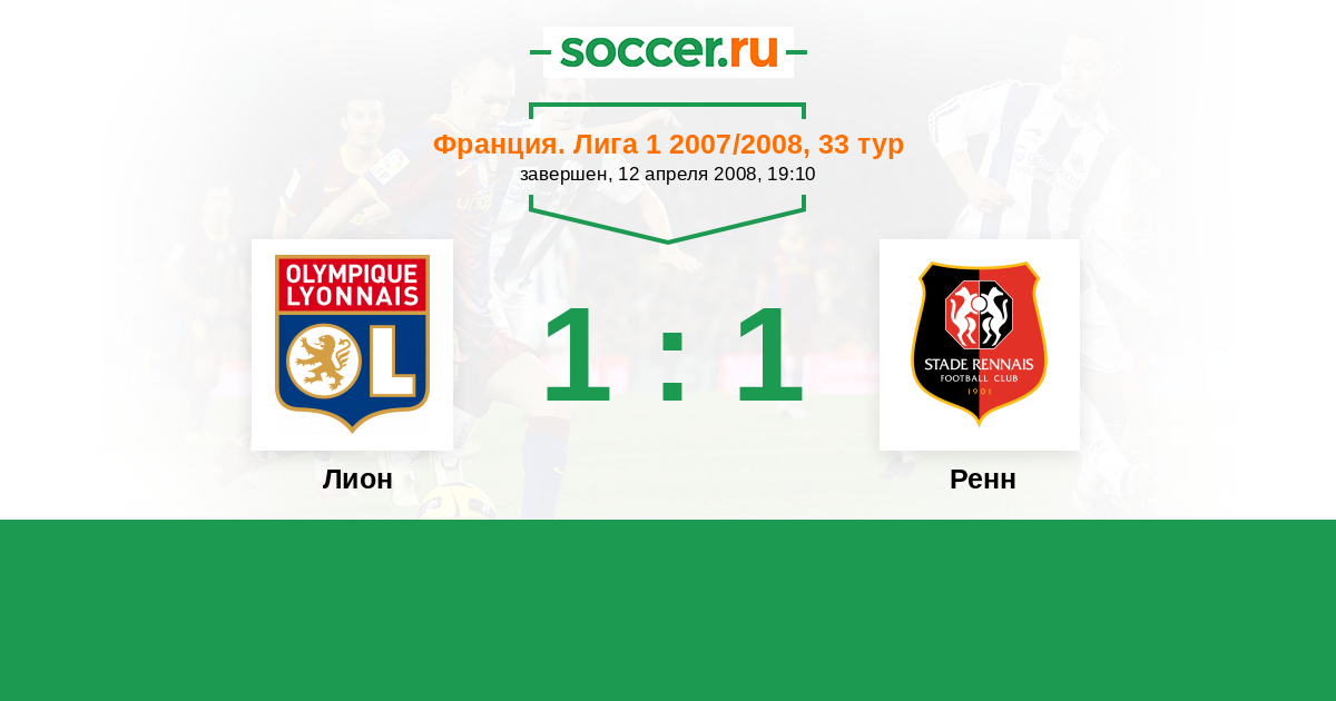 Франция. Лига 1 18.04.2007 Лион Логотип футбольный клуб Лион 0:0 Логотип футбольный клуб Ренн Ренн