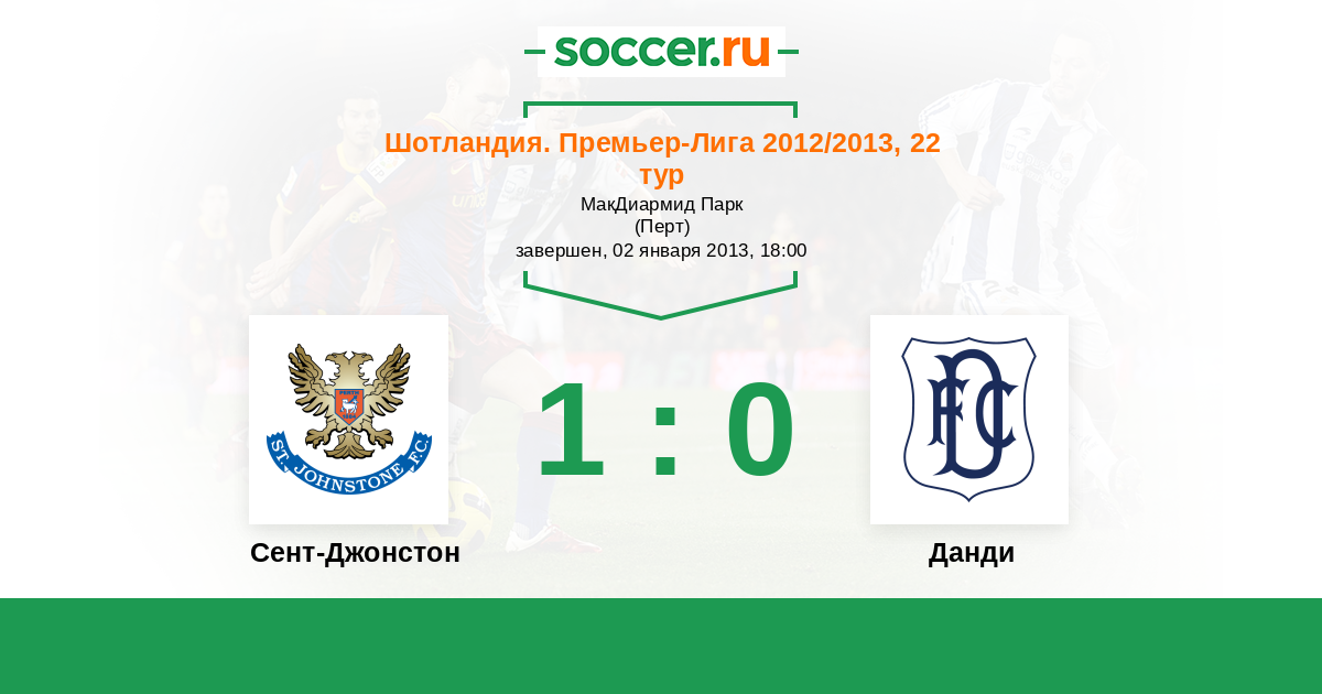 Шотландия. Премьер-Лига 29.09.2012 Данди Логотип футбольный клуб Данди 1:3 Логотип футбольный клуб Сент-Джонстон (Перт) Сент-Джонстон