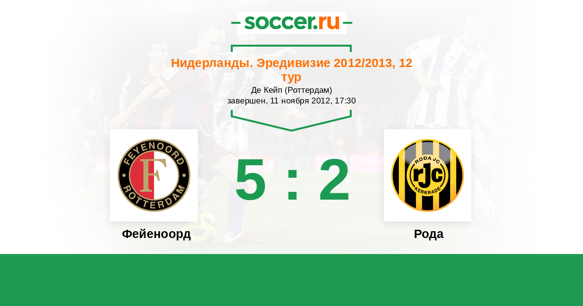Нидерланды. Эредивизи 11.04.2012 Рода Логотип футбольный клуб Рода (Керкраде) 0:0 Логотип футбольный клуб Фейеноорд (Роттердам) Фейеноорд