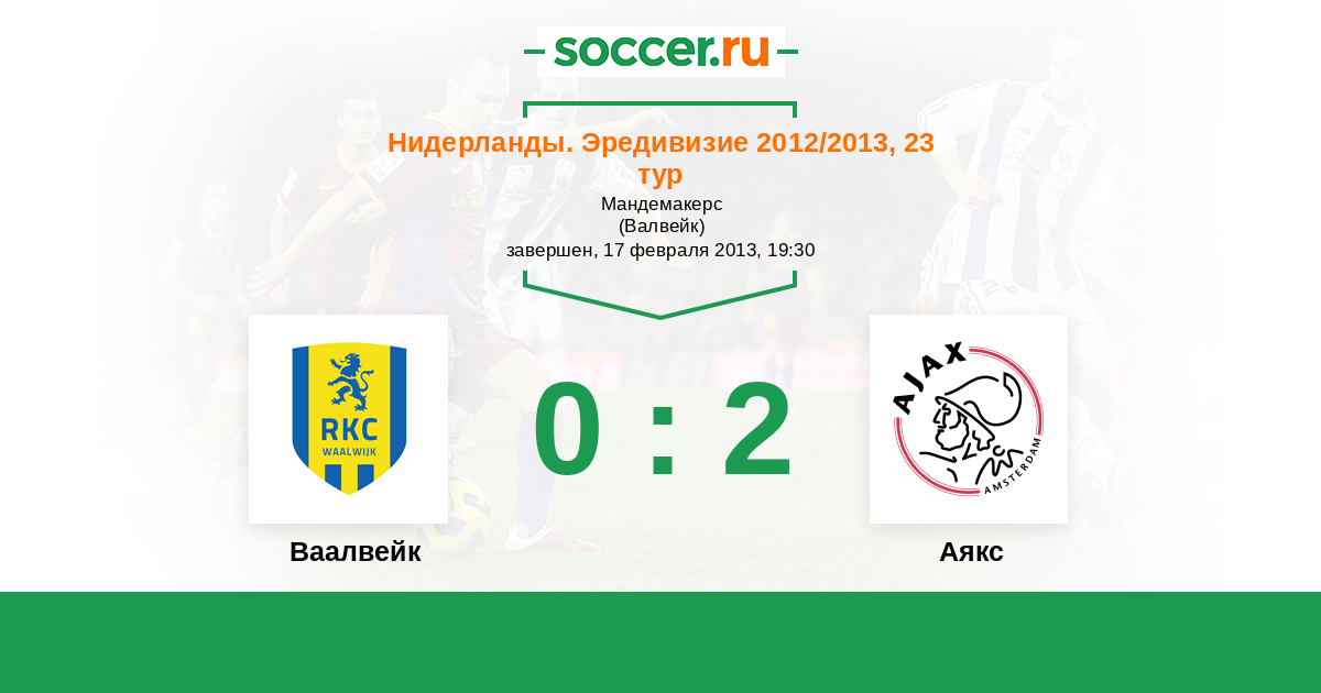 Нидерланды. Эредивизи 11.03.2012 Аякс Логотип футбольный клуб Аякс (Амстердам) 3:0 Логотип футбольный клуб Ваалвейк (Валвейк) Ваалвейк