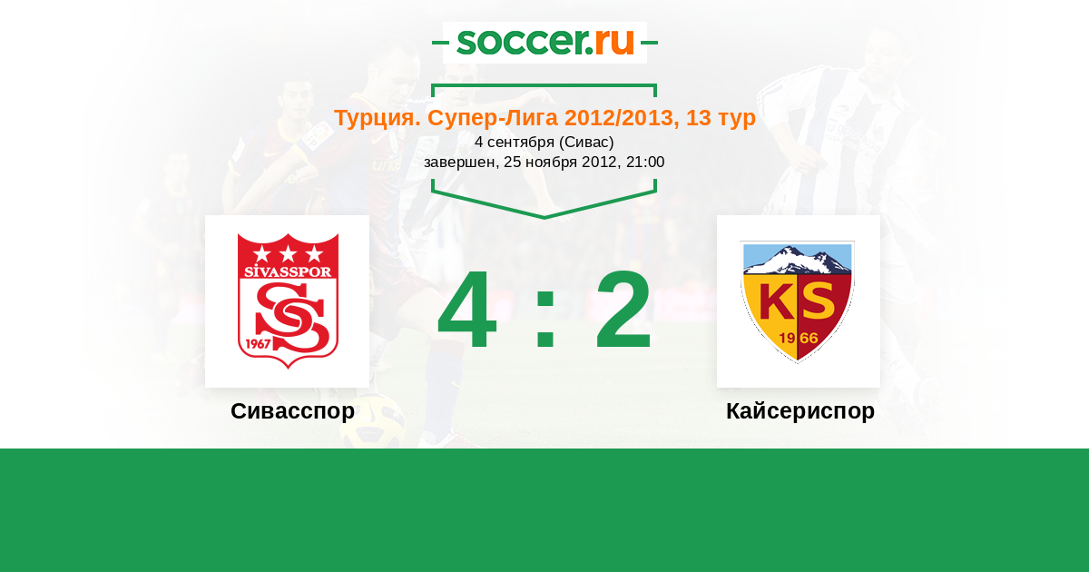 Турция. Суперлига 21.04.2013 Кайсериспор Логотип футбольный клуб Кайсериспор 1:1 Логотип футбольный клуб Сивасспор Сивасспор