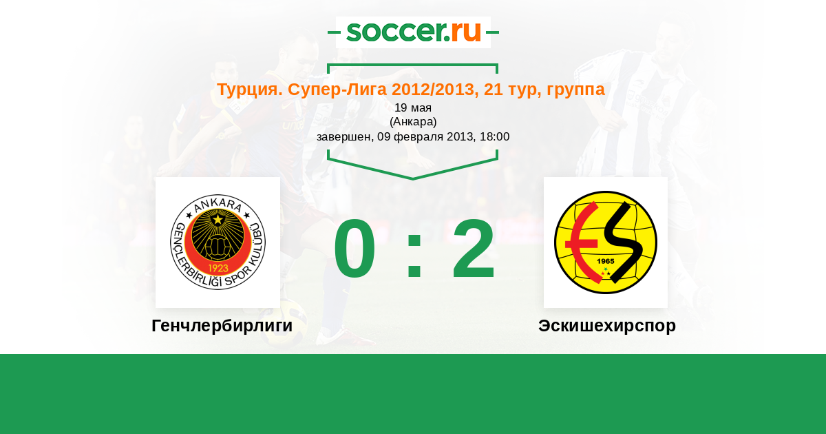 Турция. Суперлига 16.09.2012 Эскишехирспор Логотип футбольный клуб Эскишехирспор 4:2 Логотип футбольный клуб Генчлербирлиги (Анкара) Генчлербирлиги