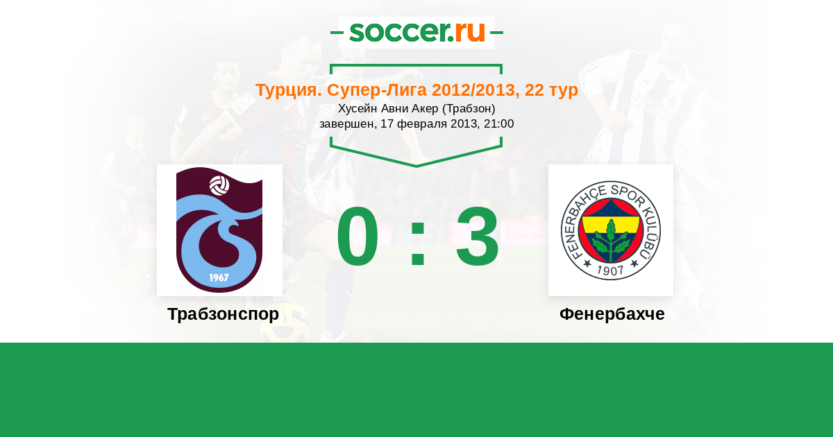 Турция. Суперлига 24.09.2012 Фенербахче Логотип футбольный клуб Фенербахче (Стамбул) 0:0 Логотип футбольный клуб Трабзонспор Трабзонспор