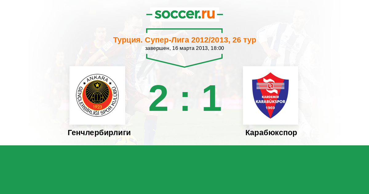 Турция. Суперлига 28.10.2012 Карабюкспор Логотип футбольный клуб Карабюкспор 0:0 Логотип футбольный клуб Генчлербирлиги (Анкара) Генчлербирлиги
