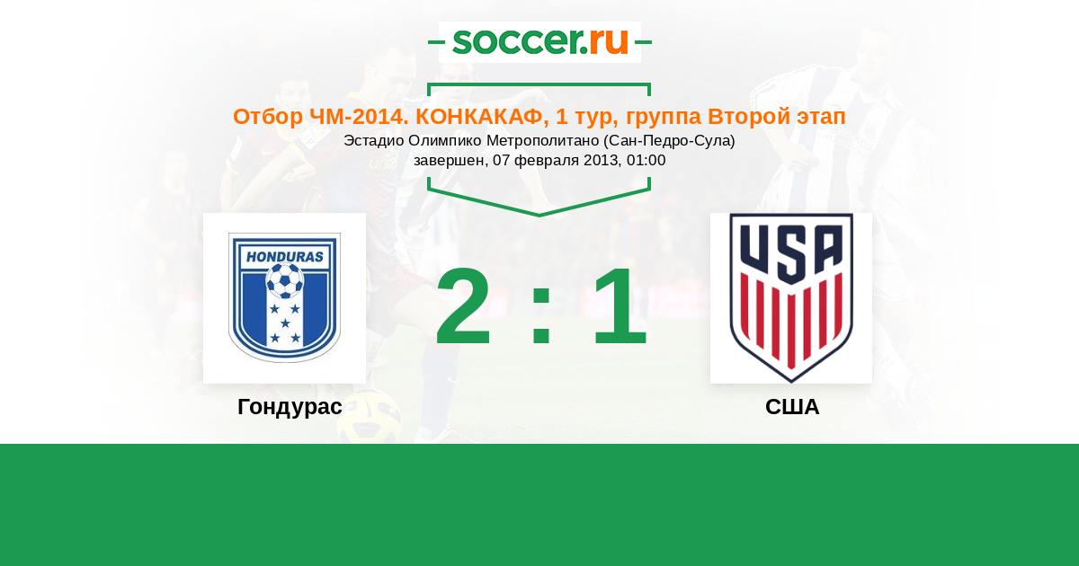 Отбор ЧМ. КОНКАКАФ 19.06.2013 США Логотип США 1:0 Логотип Гондурас Гондурас