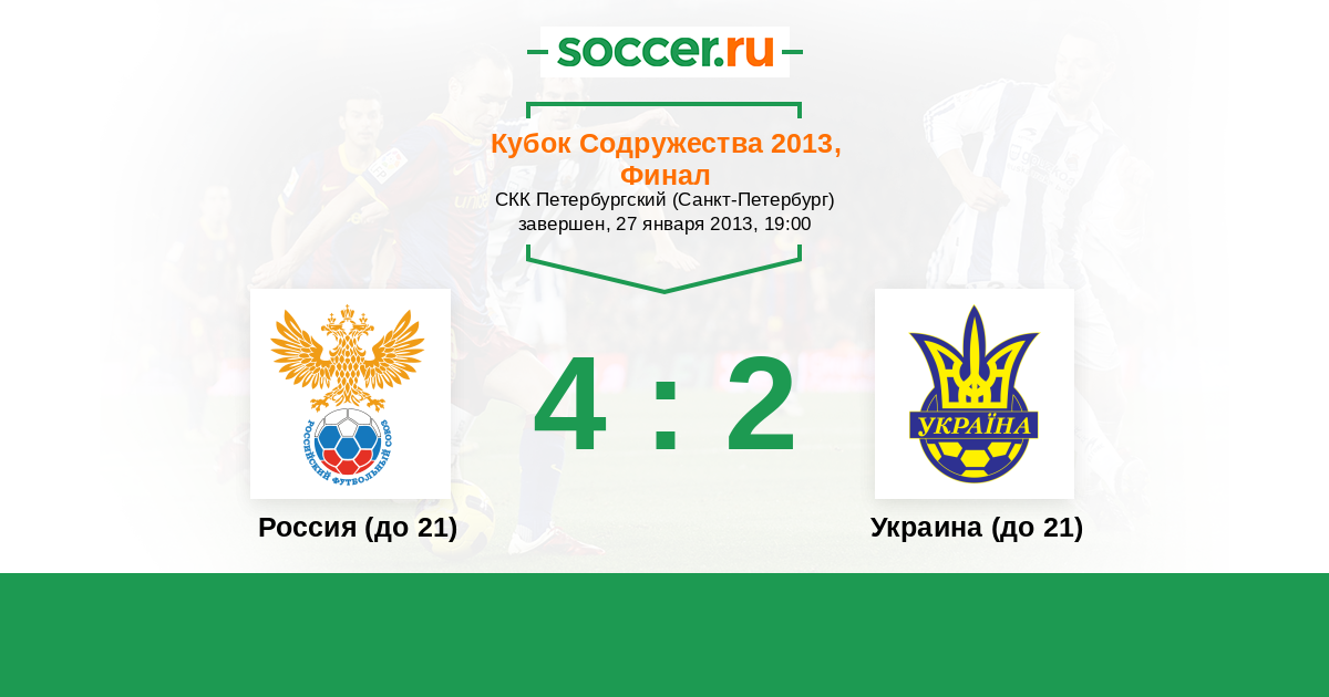 Кубок Содружества 02.02.2014 Украина (до 21) Логотип Украина (до 21) 4:0 Логотип Россия (до 21) Россия (до 21)
