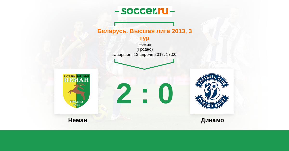 Беларусь. Высшая лига 23.06.2013 Динамо Логотип футбольный клуб Динамо (Брест) 1:1 Логотип футбольный клуб Неман (Гродно) Неман