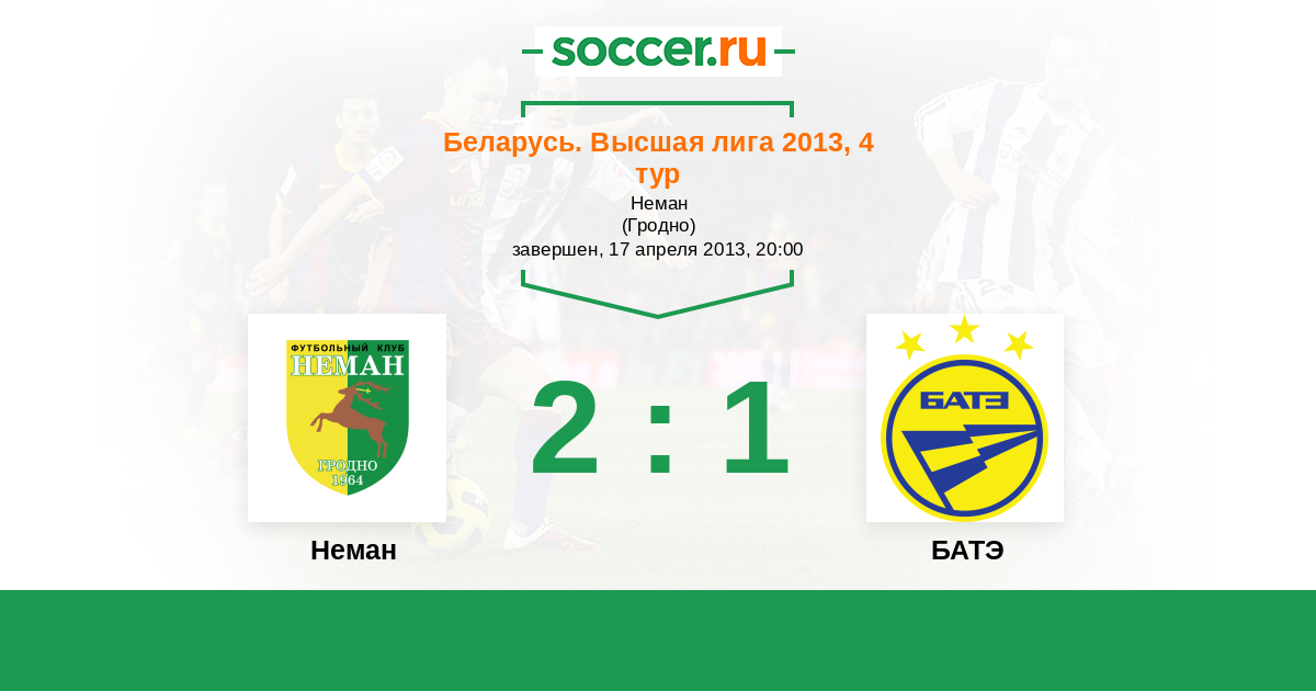 Беларусь. Высшая лига 30.06.2013 БАТЭ Логотип футбольный клуб БАТЭ (Борисов) 2:0 Логотип футбольный клуб Неман (Гродно) Неман
