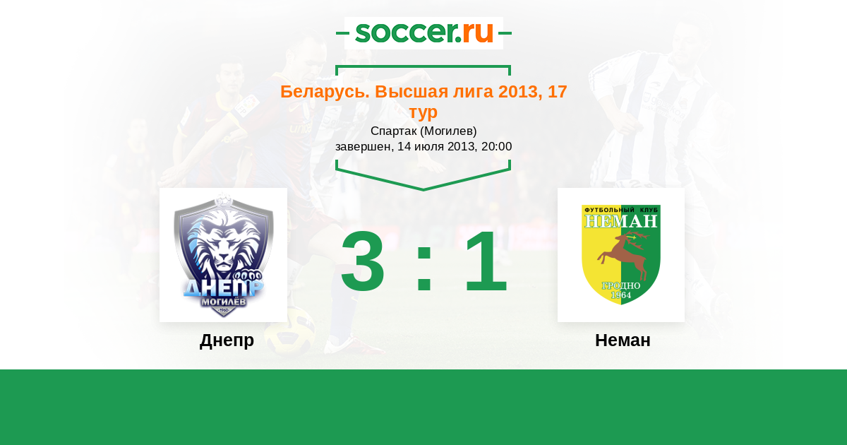 Беларусь. Высшая лига 28.06.2014 Неман Логотип футбольный клуб Неман (Гродно) 4:1 Логотип футбольный клуб Днепр (Могилев) Днепр