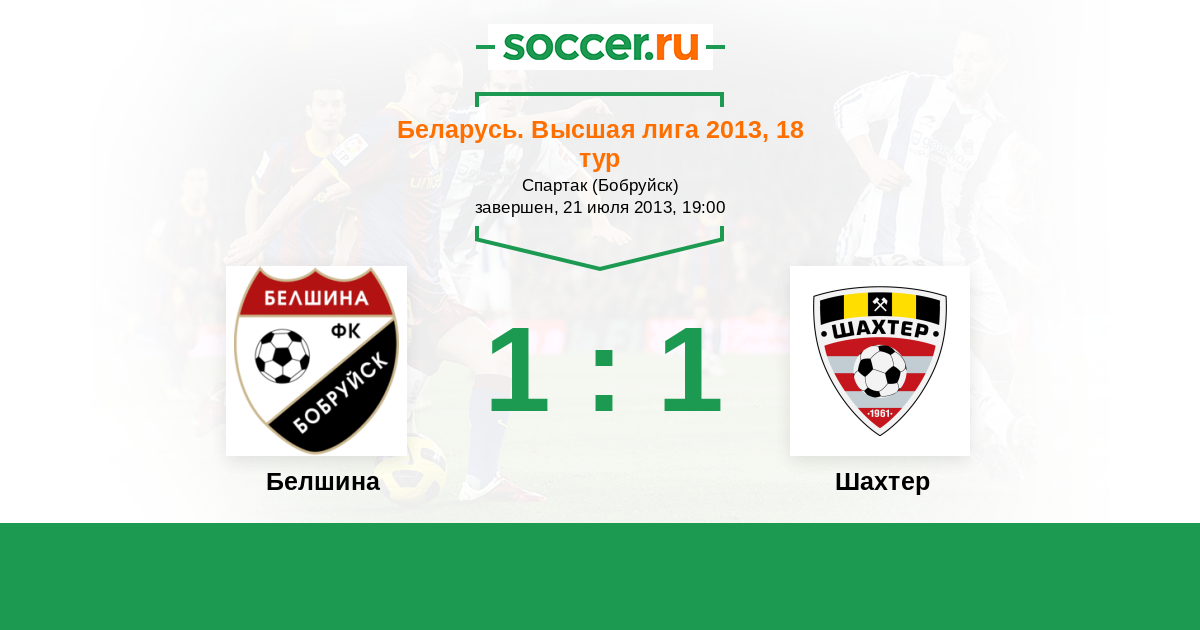 Беларусь. Высшая лига 05.05.2013 Шахтер Логотип футбольный клуб Шахтер (Солигорск) 3:0 Логотип футбольный клуб Белшина (Бобруйск) Белшина
