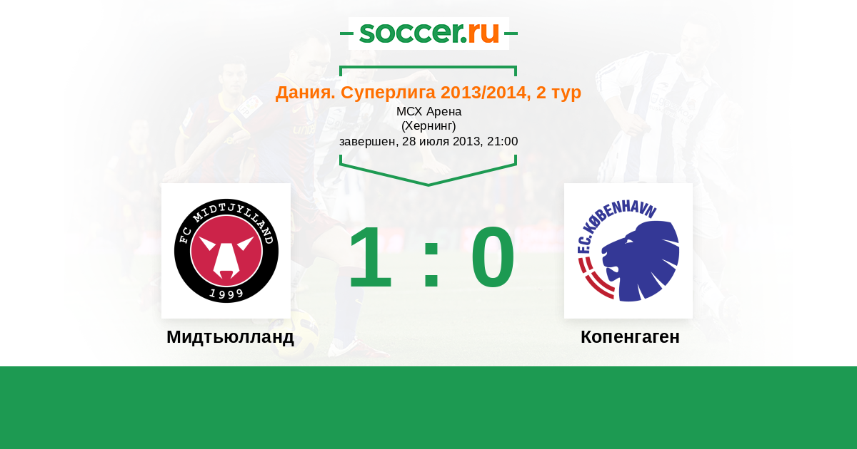 Дания. Суперлига 29.03.2013 Мидтьюлланд Логотип футбольный клуб Мидтьюлланд (Хернинг) 2:2 Логотип футбольный клуб Копенгаген Копенгаген