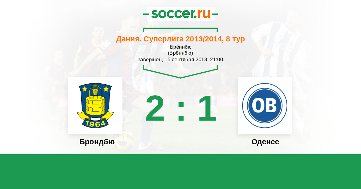 Дания. Суперлига 23.03.2014 Брондбю Логотип футбольный клуб Брондбю (Брённбю) 1:2 Логотип футбольный клуб Оденсе Оденсе