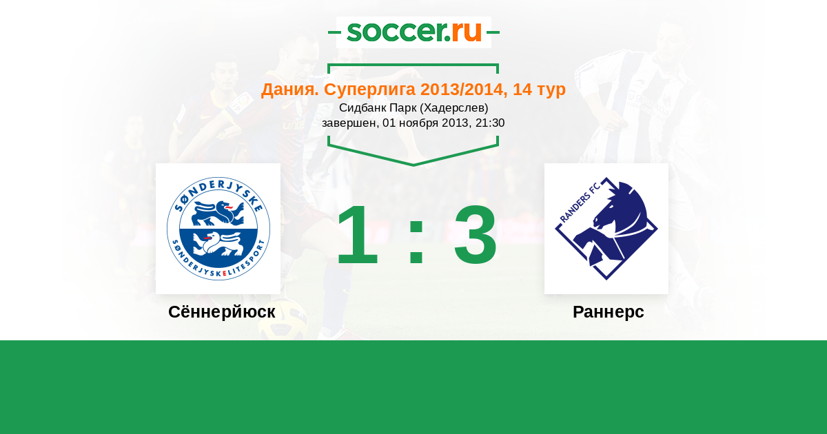 Дания. Суперлига 02.09.2013 Раннерс Логотип футбольный клуб Раннерс 0:2 Логотип футбольный клуб Сённерйюск (Хадерслев) Сённерйюск