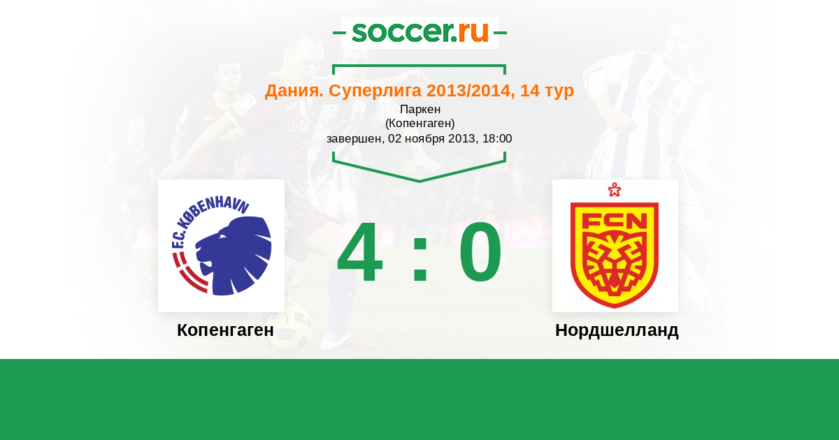 Дания. Суперлига 09.11.2014 Нордшелланд Логотип футбольный клуб Нордшелланд (Фарум) 0:0 Логотип футбольный клуб Копенгаген Копенгаген