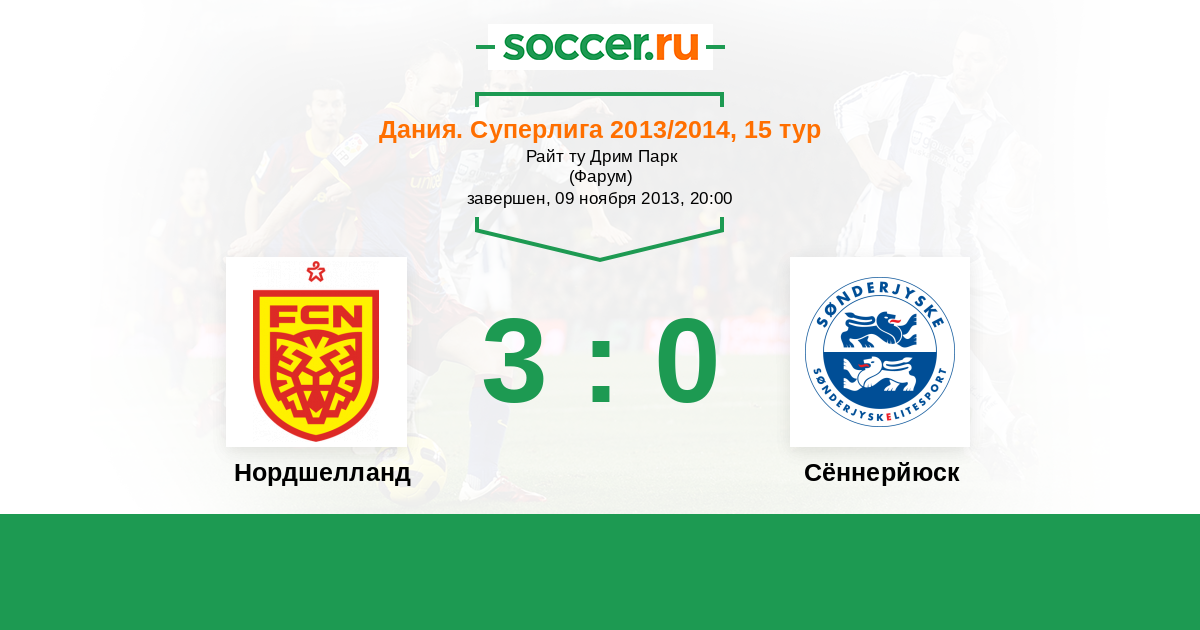 Дания. Суперлига 22.09.2013 Сённерйюск Логотип футбольный клуб Сённерйюск (Хадерслев) 2:0 Логотип футбольный клуб Нордшелланд (Фарум) Нордшелланд