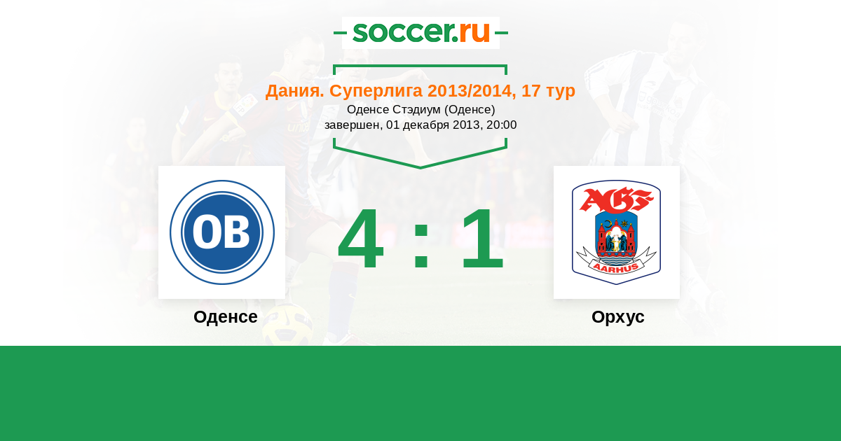 Дания. Суперлига 05.05.2014 Орхус Логотип футбольный клуб Орхус 0:1 Логотип футбольный клуб Оденсе Оденсе