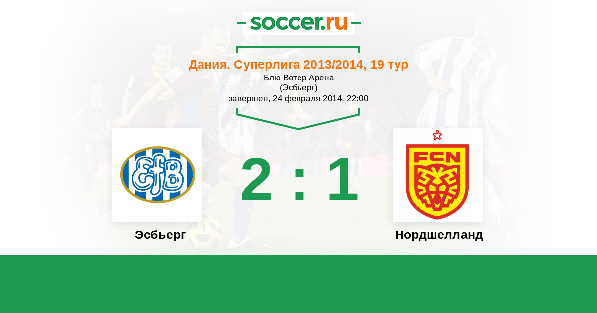 Дания. Суперлига 14.04.2014 Нордшелланд Логотип футбольный клуб Нордшелланд (Фарум) 0:1 Логотип футбольный клуб Эсбьерг Эсбьерг