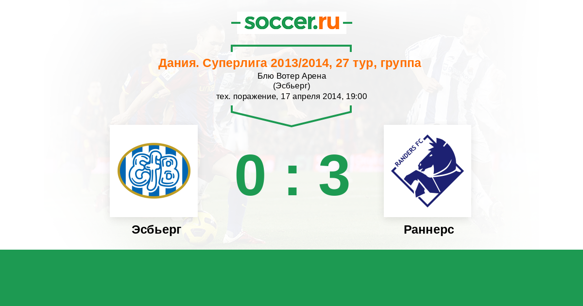 Дания. Суперлига 14.04.2013 Эсбьерг Логотип футбольный клуб Эсбьерг 4:0 Логотип футбольный клуб Раннерс Раннерс