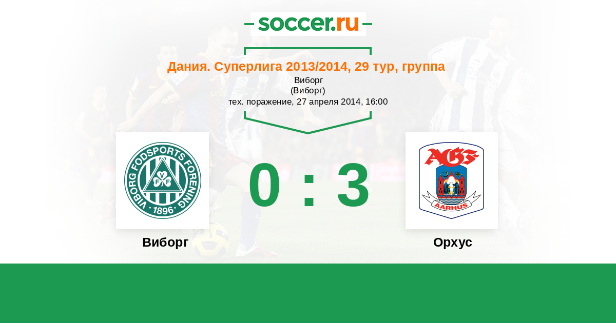 Дания. Первый дивизион 02.11.2014 Виборг Логотип футбольный клуб Виборг 3:0 Логотип футбольный клуб Орхус Орхус