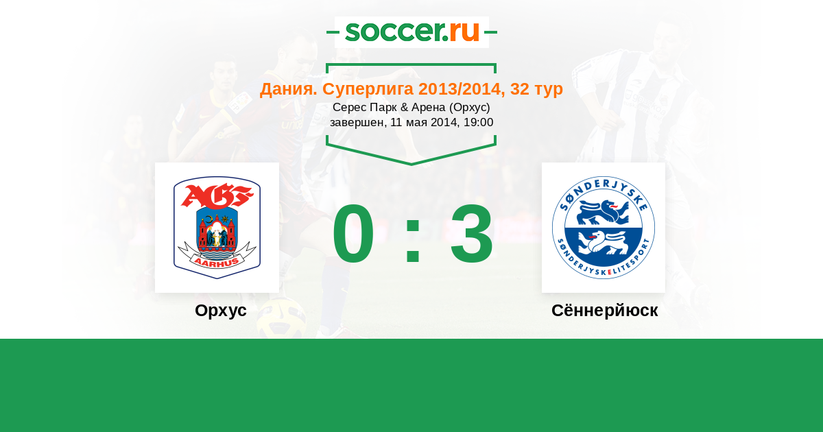 Дания. Суперлига 11.05.2013 Орхус Логотип футбольный клуб Орхус 2:1 Логотип футбольный клуб Сённерйюск (Хадерслев) Сённерйюск