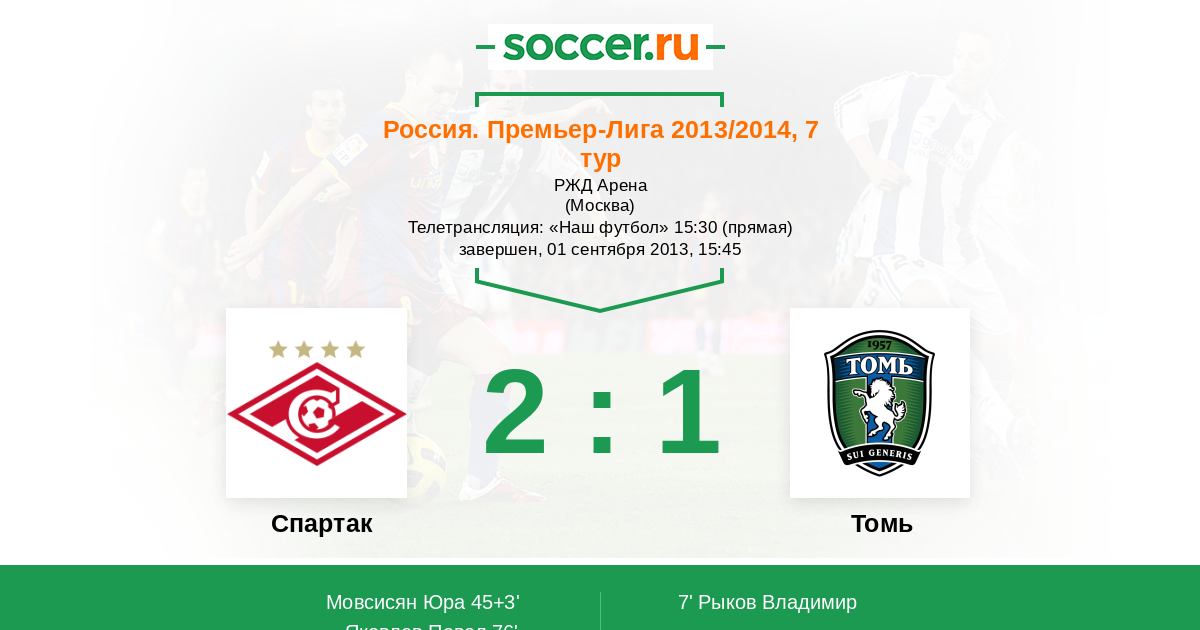 Протокол матча Спартак против Томь